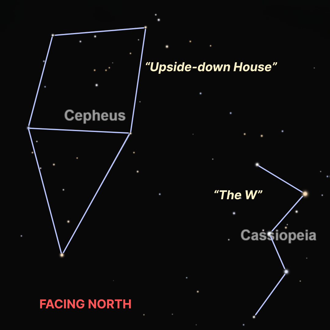 King Cepheus is a constellation named after the king of Ethiopia in Greek mythology. Look for an upside-down house in the northern part of the sky around 9pm in November.